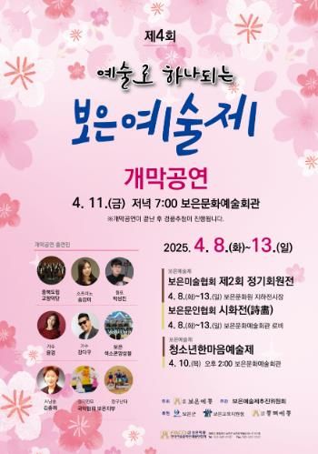 (아름다운교육신문) 보은군은 지역 예술인과 군민이 예술로 하나되는‘제4회 보은예술제’가 오는 13일까지 보은문화예술회관 및 보은문화원에서 열린다고 밝혔다.