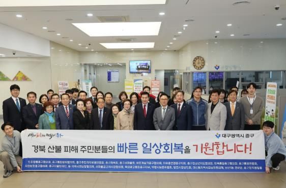 류규하 중구청장은 “예기치 못한 산불로 삶의 터전을 잃은 이재민 여러분께 깊은 위로의 말씀을 전한다”며 “중구청 직원들과 지역 단체들이 한마음으로 모은 성금이 피해 주민들에게 조금이나마 힘과 위로가 되기를 바라며, 앞으로도 어려운 이웃을 돕는 데 최선을 다하겠다”고 말했다.