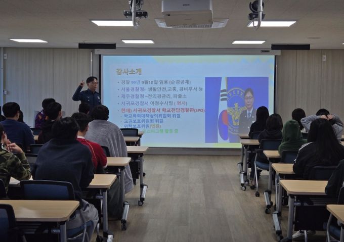 (아름다운교육신문) 제주도교육청 중문고등학교는 8일 학교 청송배움터에서 학교전담경찰을 초청하여 2학년 121명을 대상으로‘함께 만들어요, 학교폭력 없는 안전·건강 배움터!’를 주제로 학교폭력 예방 교육을 실시했다.