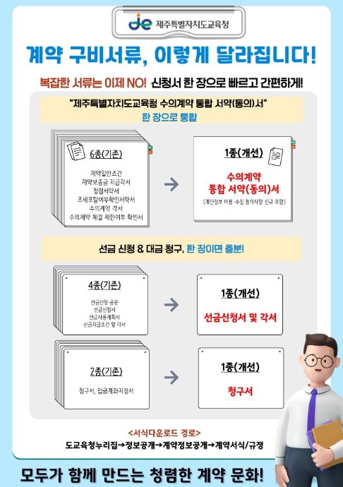 (아름다운교육신문) 제주특별자치도교육청은 9일 지난해 8월부터 추진한 ‘계약서류 간소화 사업’이 계약업무 담당자와 계약업체 양측 모두에게 계약업무 경감에 도움이 되어 만족도가 높은 것으로 조사됐다고 밝혔다.