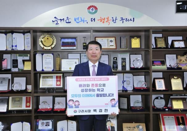 (아름다운교육신문) 백경현 구리시장은 지난 4월 7일 건강한 학교문화를 조성하기 위한 ‘상호존중 학교문화 조성 릴레이 캠페인’에 동참했다.