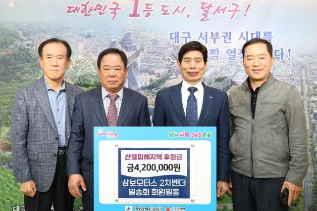 (아름다운교육신문) 대구 달서구가 삼보모터스 2차벤더 일송회 회원들로부터 산불피해지역에 지원해 달라며 후원금 420만원을 기탁 받았다고 9일 밝혔다.