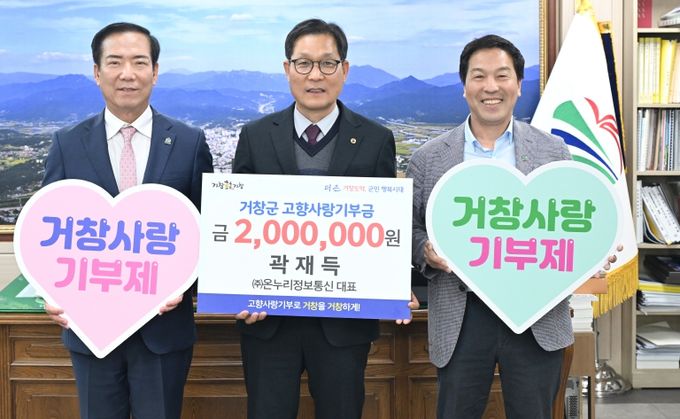 (아름다운교육신문) 거창군은 지난 9일 ㈜온누리정보통신(합천군 소재) 곽재득 대표가 고향사랑기부금 200만 원을 군에 기부했다고 전했다.