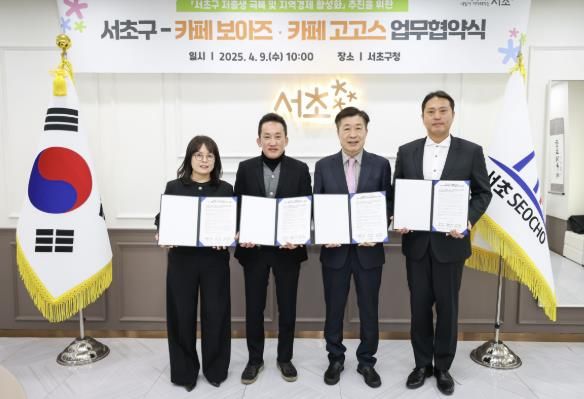 (아름다운교육신문) 서울 서초구가 9일 서초구청에서 지역 내 소상공인 업체인 카페 보아즈, 카페 고고스와 함께 ‘서초구 저출생 극복 및 지역경제 활성화’ 추진을 위한 업무협약(MOU)을 체결했다고 밝혔다.