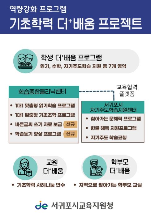 (아름다운교육신문) 서귀포시교육지원청은 5월 6일부터 오는 7월 18일까지 관내 학습지원대상 학생을 대상으로 2025 기초학력 더+배움 사업으로 ‘학기 중 자기주도 학습지도’ 프로그램을 운영한다.