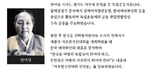 연미당 지사는 엄항섭 지사와 부부로, 일제강점기 중국에서 상해여자청년동맹, 한국애국부인회 등을 중심으로 활동하며 독립운동계의 공동 항일연합전선 구축 운동을 주도했다. 윤봉길 의사 의거에 사용된 도시락폭탄을 싼 보자기를 제작했다.