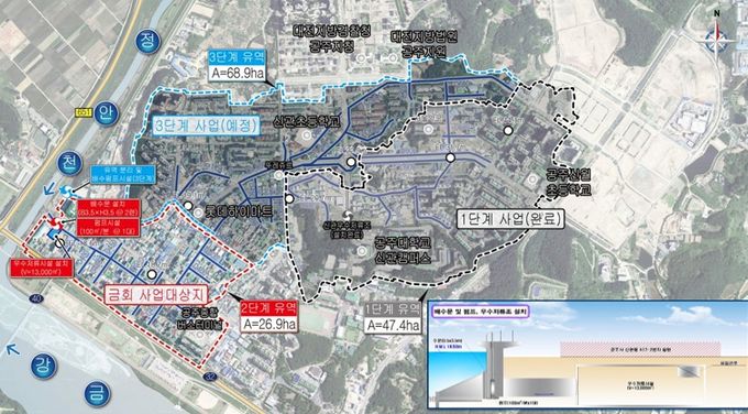 사업이 완료되면 금강과 정안천 합류 지점에서 발생하는 외수위 상승과 우수관로 용량 부족 문제로 인한 도심 침수 문제를 개선해, 총 23만 3660㎡ 규모의 지역이 침수로부터 보호받을 수 있을 전망이다.