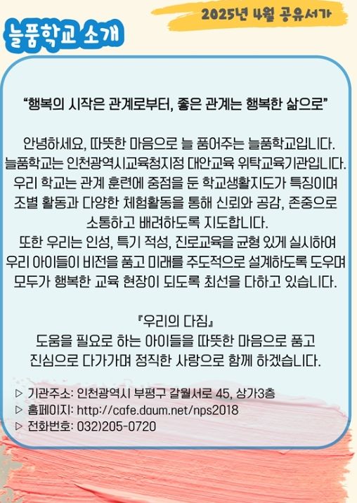 늘품학교는 학업 중단 위기 학생들을 위한 인천교육청 산하 대안교육 기관으로, 다양한 체험 활동을 통해 소통과 배려의 가치를 교육하고 있다.