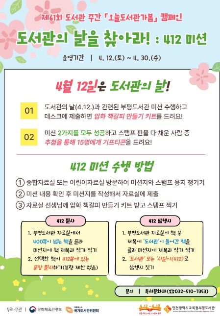 4월 12일인 도서관의 날과 도서관 주간을 맞아 진행되는 이번 캠페인은 ‘도서관의 날을 찾아라: 412’라는 주제로 ‘412 필사 미션’과 ‘412 삼행시 미션’을 운영한다.
