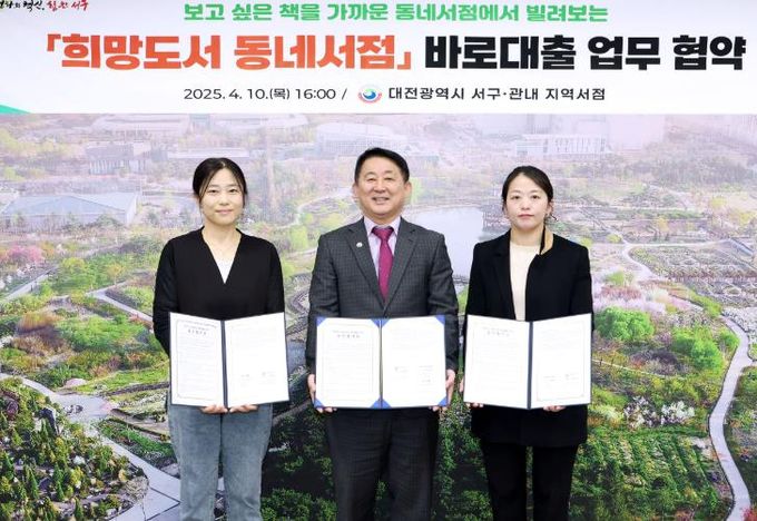 (아름다운교육신문) 대전 서구는 이달 10일 구청 갑천누리실에서 지역서점 2개소와‘희망도서 동네서점 바로대출’서비스를 위한 업무협약을 추가로 체결했다.