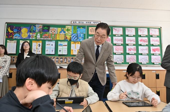 (아름다운교육신문) 임종식 경북교육감은 11일 예천군에 있는 예천초등학교를 방문해 AI 디지털 교과서 활용 수업을 참관했다.
