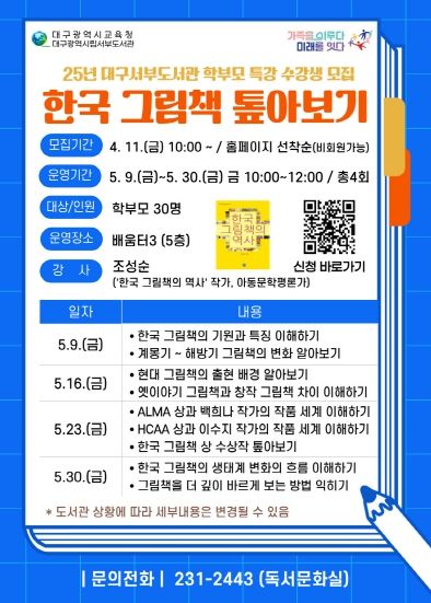 (아름다운교육신문) 대구서부도서관은 4월 11일부터 도서관 누리집을 통해 ‘한국 그림책 톺아보기’ 강좌에 참여할 학부모 30명을 모집한다고 밝혔다.