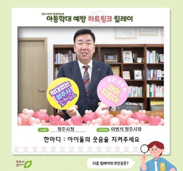 그러면서 “아동학대 예방은 우리 사회 전체가 함께 해결해야 할 과제”라며 “청주시민 모두의 마음이 연결된다면 아이들이 더 안전하고 행복한 환경에서 성장할 수 있을 것”이라고 강조했다.