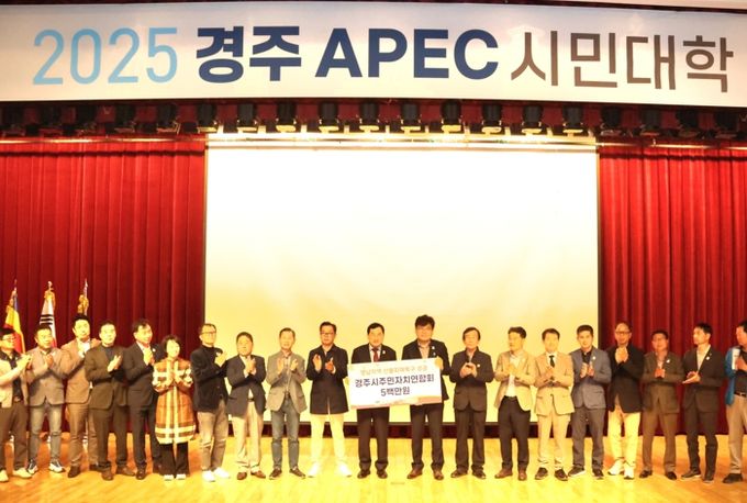 경주시는 지난 11일 동국대학교 WISE캠퍼스 대강당에서 열린 ‘2025 경주 APEC 시민대학’ 행사 중 산불 피해 복구를 위한 성금 전달식을 가졌다고 밝혔다.