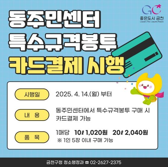 (아름다운교육신문) 금천구는 동주민센터에서 특수규격봉투 신용카드 결제 서비스를 전면 시행한다고 밝혔다.
