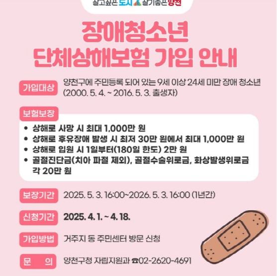 지원대상은 양천구에 거주하는 9세 이상 24세 미만(2000. 5. 4. ~ 2016. 5. 3. 출생자) 등록장애인 787명으로, 보험기간은 2025년 5월 3일부터 2026년 5월 3일까지 1년이다.