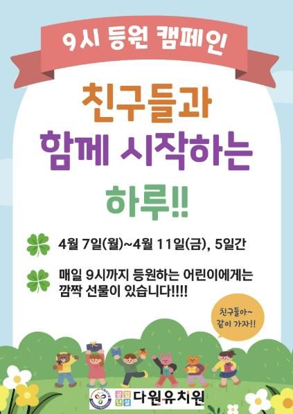 (아름다운교육신문) 화성시 다원유치원은 새로운 유치원에서의 생활에 잘 적응하고 9시 등원 시간을 잘 지킨 유아들을 응원하기 위하여 4월 7일부터 11일까지 총 5일간 “친구들과 함께 시작하는 하루” 9시 등원 캠페인을 실시했다.