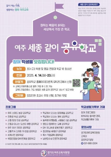 (아름다운교육신문) 경기도여주교육지원청은 오는 4월 14일부터 23일까지 ‘2025 여주 세종 같이 공유학교’ 2차 프로그램 수강신청을 받는다고 밝혔다.