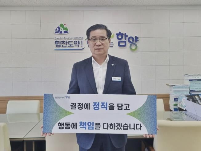 첫 번째 주자로 나선 진병영 함양군수는 ‘결정에 정직을 담고, 행동에 책임을 다하겠습니다’라는 청렴 다짐 메시지를 전파하며 캠페인의 시작을 알렸다. 이 문구에는 군정을 이끌어가는 책임자로서의 각오와 함께, 군민을 위한 올곧은 행정을 실현하겠다는 의지가 담겨있다.