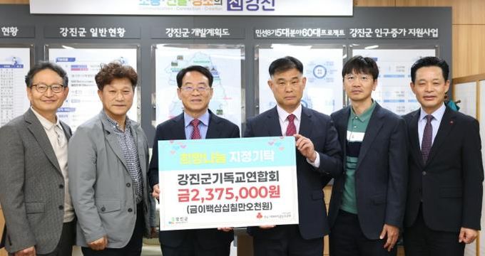 이들은 지난 14일 강진군청을 방문해 어려운 이웃을 위한 성금 200만 원과 강진군민을 위한 기도회에서 모은 헌금 237만 5천 원을 기탁했다.