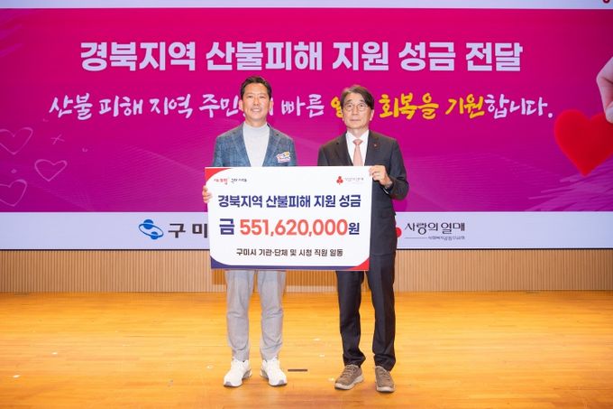 성금은 김장호 구미시장의 개인 성금 500만 원을 포함한 시청 공직자들이 자발적으로 모은 2,832만 원, 지역사회 각계각층에서 십시일반 정성을 보탠 5억 2,330만 원으로 마련됐다.