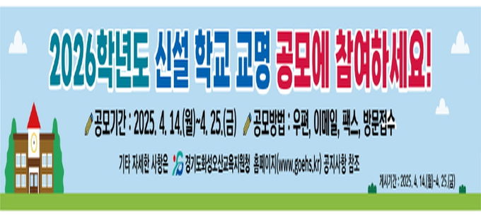 한편 각 학교별 학교명 공모 당선작 공모자에게는 소정의 상품이 전달될 예정이며, 기타 자세한 사항은 화성오산교육지원청 누리집 ‘공지사항’란의 공모 안내문을 참고하면 된다.