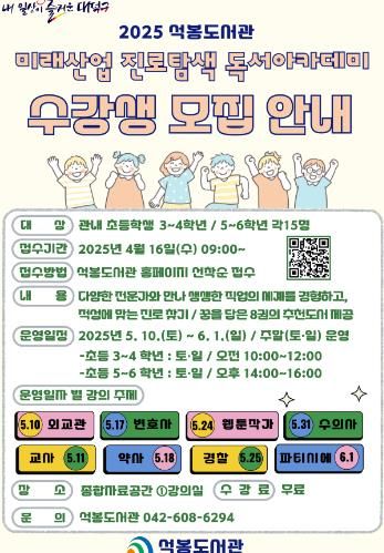 대덕구 석봉도서관은 초등학교 3~6학년을 대상으로 미래산업 진로 탐색 독서아카데미 수강생을 모집한다고 15일 밝혔다.