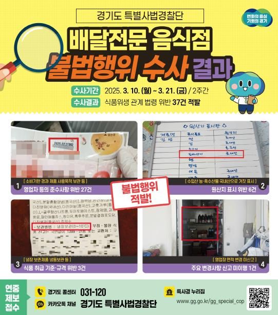 경기도는 지난 3월 10일부터 21일까지 2주간 도내 배달전문 음식점 360개를 대상으로 집중 수사를 한 결과, 총 37건의 불법행위를 적발했다고 15일 밝혔다.