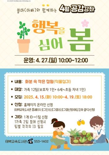 (아름다운교육신문) 태백교육도서관은 유초등 자녀와 부모로 구성된 가족 12팀(총 24명)을 대상으로 4월 27일(일) 오전 10시부터 태백교육도서관 1층 다목적실에서 4월 공감강좌 ‘행복을 심어 봄! 화분 속 작은 정원’을 운영한다.