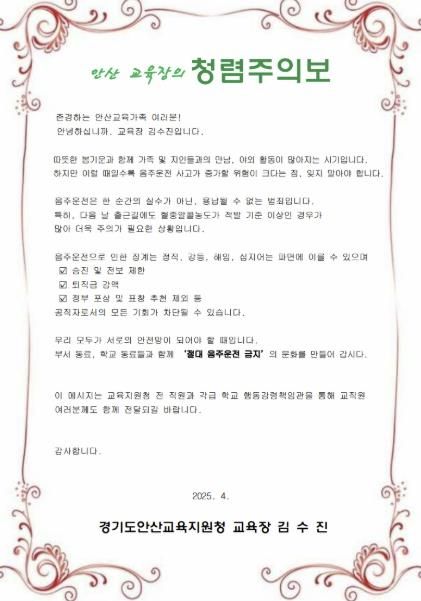 김수진 교육장은 ‘청렴 주의보’ 메시지를 통해 “따뜻한 봄기운과 함께 야외활동이 많아지는 시기일수록 음주운전 사고의 위험이 높아진다”고 강조하며, “음주운전은 단순한 실수가 아닌 공직자의 모든 기회가 박탈될 수 있는 범죄”라고 경고했다.