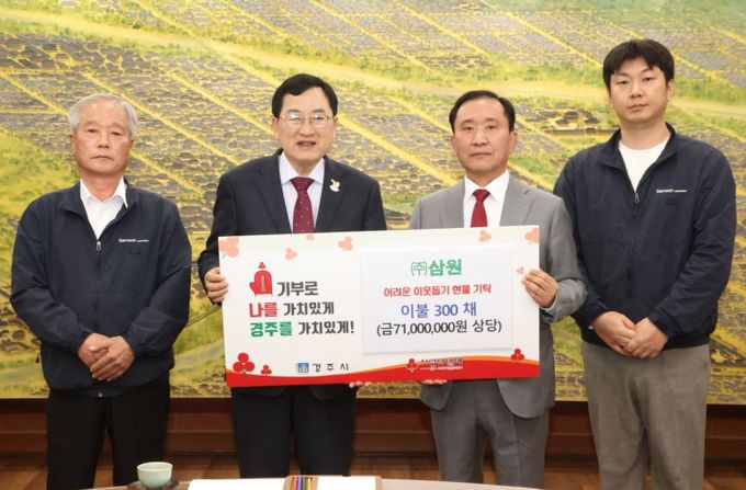 (아름다운교육신문) 2025년 4월 13일, ㈜삼원은 경주시 지역 내 어려운 이웃들을 위해 이불 300채(약 7,100만원 상당)를 기탁했다.