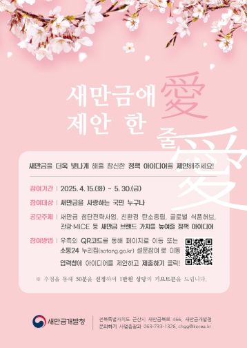 새만금에 관심 있는 국민 누구나 참여할 수 있으며, 4월 15일부터 5월 30일까지 '‘소통24 누리집’의 설문조사 참여'를 통해 접수하면 된다.
