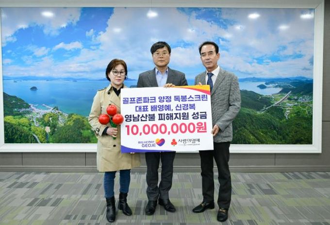 (아름다운교육신문) 거제시는 15일 양정 독봉스크린 골프가 산불 피해 복구를 위해 성금 1,000만 원을 기탁했다고 밝혔다.