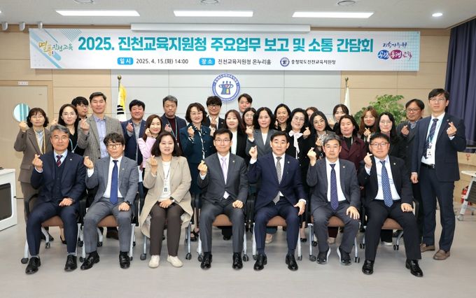 (아름다운교육신문) 진천교육지원청은 4월 15일 교육지원청 온누리홀에서 윤건영 충청북도교육감이 참석한 가운데 2025년 주요업무 보고 및 소통 간담회를 가졌다. 이 자리에는 충청북도교육청 정책기획과 관계자와 진천교육지원청 교육장을 비롯한 관계자, 관내 학교급별 관리자 대표 등 30여 명이 참석했다.