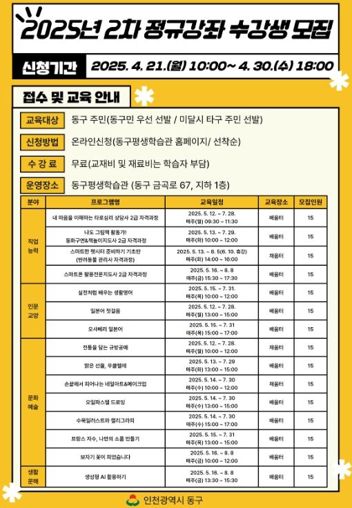 (아름다운교육신문) 인천 동구는 오는 21일~30일까지 지역주민을 대상으로 2025년 2차 정규강좌 수강생을 모집한다고 밝혔다.