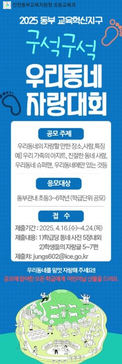 (아름다운교육신문) 인천동부교육지원청은 24일까지 지역 연계 교육 활성화를 위해 관내 초등학교 3~6학년 학급을 대상으로 ‘2025 동부 교육혁신지구 구석구석 우리동네 자랑대회’를 공모한다.