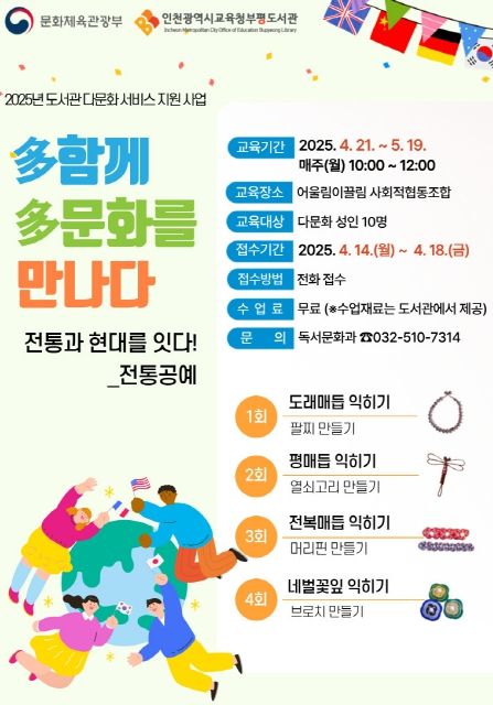 (아름다운교육신문) 인천광역시교육청부평도서관은 2025년 도서관 다문화 서비스 지원 사업의 일환으로 오는 4월 21일부터 다문화 성인을 위한 전통공예 체험 프로그램 ‘전통과 현대를 잇다! 전통공예’를 운영한다고 밝혔다.