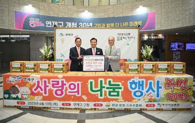 (아름다운교육신문) 연제구는 4월 10일 환경문화스포츠협회의 연계로 부산미남병원으로부터 어려운 이웃을 돕기 위한 라면 120박스를 기탁 받았다.