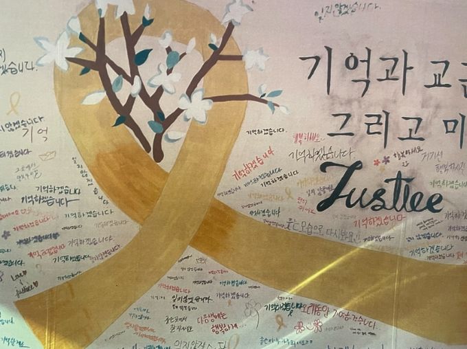 학생들은 수학여행 중 '한강에서 한강 읽기' 프로젝트를 통해 문학 작품을 접했으며, 이후 전교생과 교직원이 함께 ‘기억과 교훈, 그리고 미래’를 주제로 이어쓰기 및 조형물 제작 활동에 참여했다.