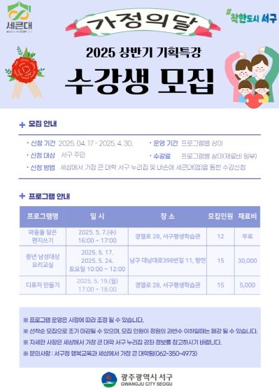 ‘세상에서 가장 큰 대학, 서구’에서 마련한 이번 특강은 ▲부모님에게 선물할 ‘특별한 카네이션 꽃바구니 만들기’ ▲마음을 담은 ‘편지쓰기 교실’ ▲사랑하는 가족들을 위한 ‘아빠 요리교실’ ▲부부를 위한 ‘디퓨저 만들기’ 등 가족 간 소통과 따뜻한 가족 사랑을 체감할 수 있는 다양한 프로그램으로 구성됐다.