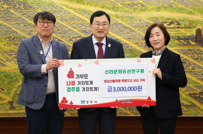 (아름다운교육신문) 2025년 4월 16일, 신라문화유산연구원은 경주시청을 방문하여 영남지역 산불 피해 이재민을 위해 성금 300만원을 기탁했다.