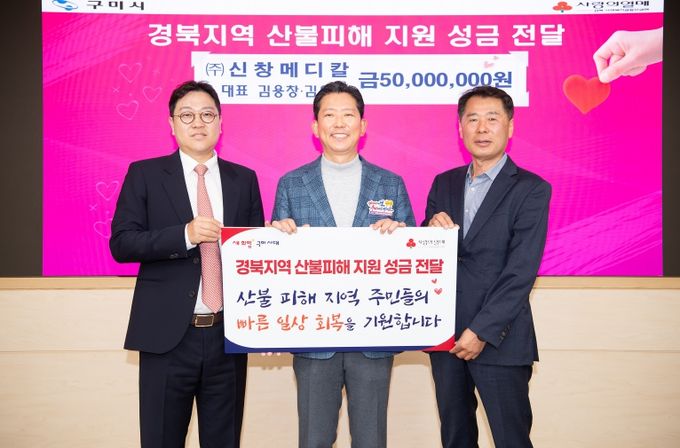 17일 (주)신창메디칼이 5천만 원, 주왕산삼계탕이 1천만 원의 성금을 구미시에 전달했다. 기탁된 성금은 경북사회복지공동모금회를 통해 피해 주민들의 일상 회복을 위한 생계비와 복구 지원 등에 사용될 예정이다.
