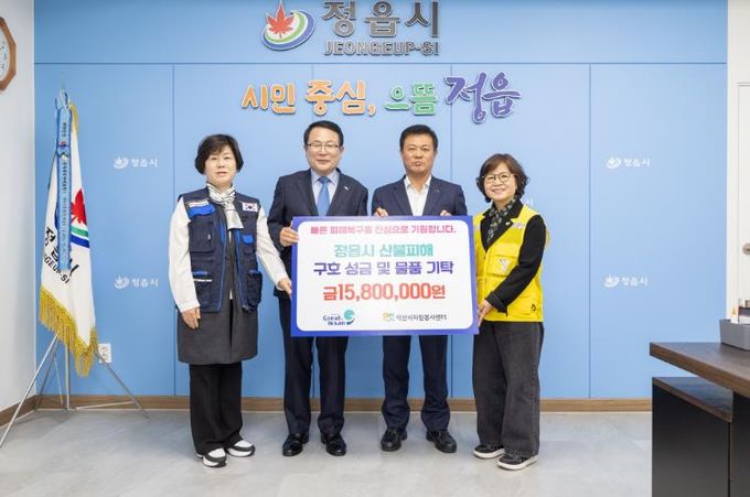 정헌율 익산시장은 17일 정읍시청을 찾아, 정읍지역 산불 피해 주민을 위한 성금 1,580만 원과 구호물품을 직접 전달했다.