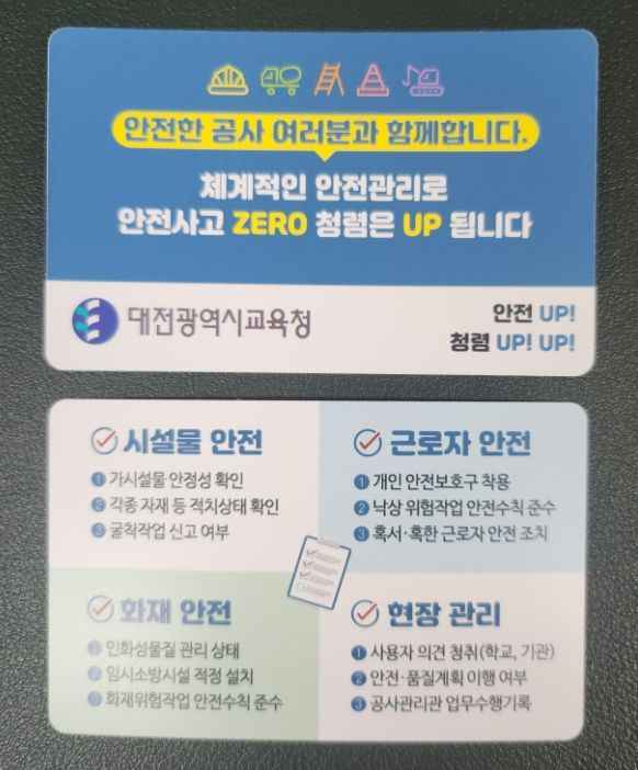 대전시교육청 조광민 시설과장은 “청렴안전키트를 활용하여 학교 공사현장에서 안전 및 관리감독을 강화함으로써 안전사고 예방에 최선을 다할 것이다.”며, “공사현장에서도 스스로 청렴하고 안전한 문화가 정착될 수 있도록 적극 동참해달라”라고 말했다.