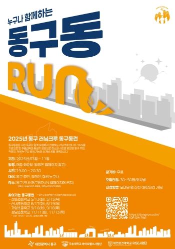 프로그램은 오는 11월까지 매주 화요일 저녁 7시, 대동천과 우송대·대전보건대 운동장 등에서 총 40회에 걸쳐 운영되며, 참여 신청은 전용 웹사이트 또는 카카오톡 오픈채팅 ‘동구동런’ 검색을 통해 하면 된다. 일정 확인 후, 현장 참여도 가능하다.
