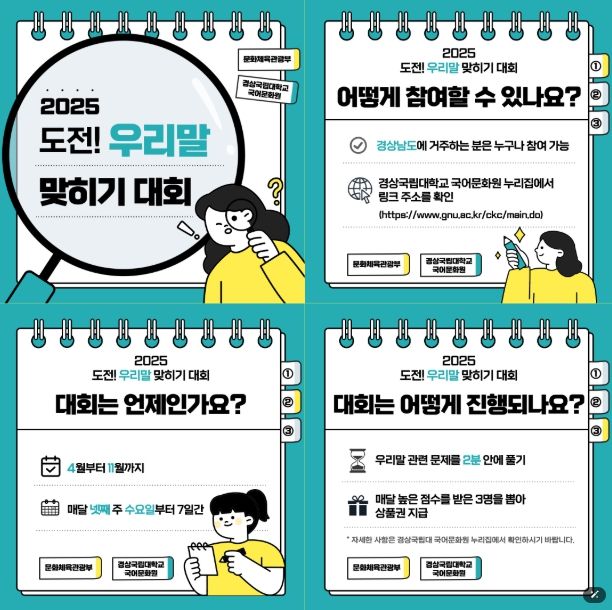 (아름다운교육신문) 경상국립대학교(GNU·총장 권진회) 국어문화원(원장 정영훈 국어국문학과 교수)은 경상남도민을 대상으로 ‘2025 도전! 우리말 맞히기 대회’를 개최한다.