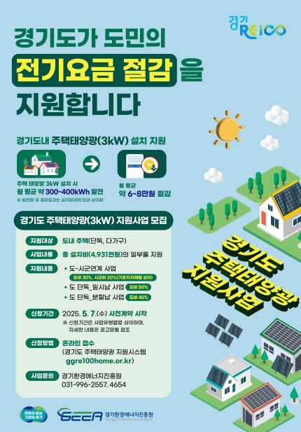 (아름다운교육신문) 경기도가 단독주택에 태양광 설비 설치를 지원해 가구별 전기요금 절감에 기여하는 ‘2025 경기도 주택태양광 지원사업’ 참여자를 5월부터 모집한다.