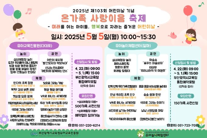 (아름다운교육신문) 부산광역식교육청 유아교육진흥원은 어린이날을 맞아 오는 5월 5일 오전 10시부터 다대포 유아교육진흥원과 철마 유아놀이체험센터에서 3~5세 유아, 학부모, 시민 등 2,000여 명을 대상으로 ‘온가족 사랑이음 축제’를 개최한다.