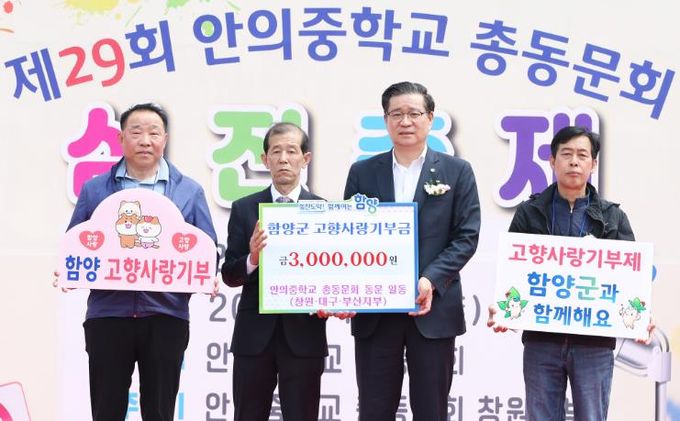 (아름다운교육신문) 함양 안의중학교 총동문회는 지난 4월 19일 오전, 안의중학교 운동장에서 열린 ‘제29회 총동문회(심진축제)’ 개회식에서 고향 함양의 발전을 염원하며 고향사랑기부금 300만 원을 기탁했다.