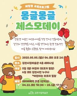 '몽글몽글 제스모데이'는 5일(월)에는 어린이를, 6일에는 김천시민 누구나를 대상으로 오후 2시부터 4시까지 운영되며, 어린이 참가자는 보호자 동반이 필수다.